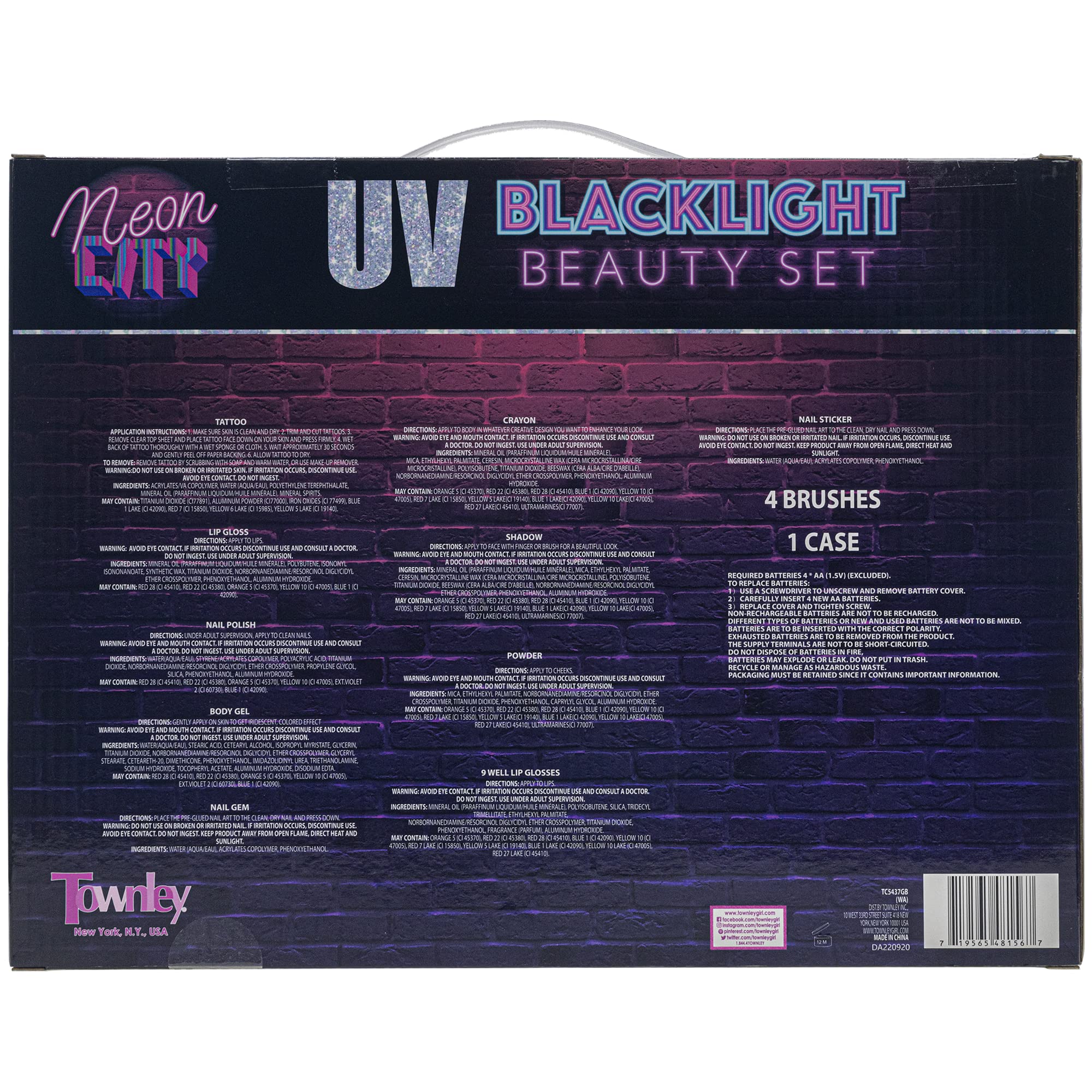 Introducing the TownleyGirl UV Blacklight Cosmetic Vanity Set! With bold colors and unique UV make-up products, girls will have a blast getting creative and innovative with their make-up looks. Whether it's for a Blacklight Party or just for fun, this set will make any occasion more exciting. And the best part? They don't have to wait until Halloween to use it! Our mission at TownleyGirl is to provide products that allow girls to explore their personal style and emulate their role models. With the UV Blacklight Cosmetic Vanity Set, they'll have all the tools they need to express themselves and have a great time doing it.